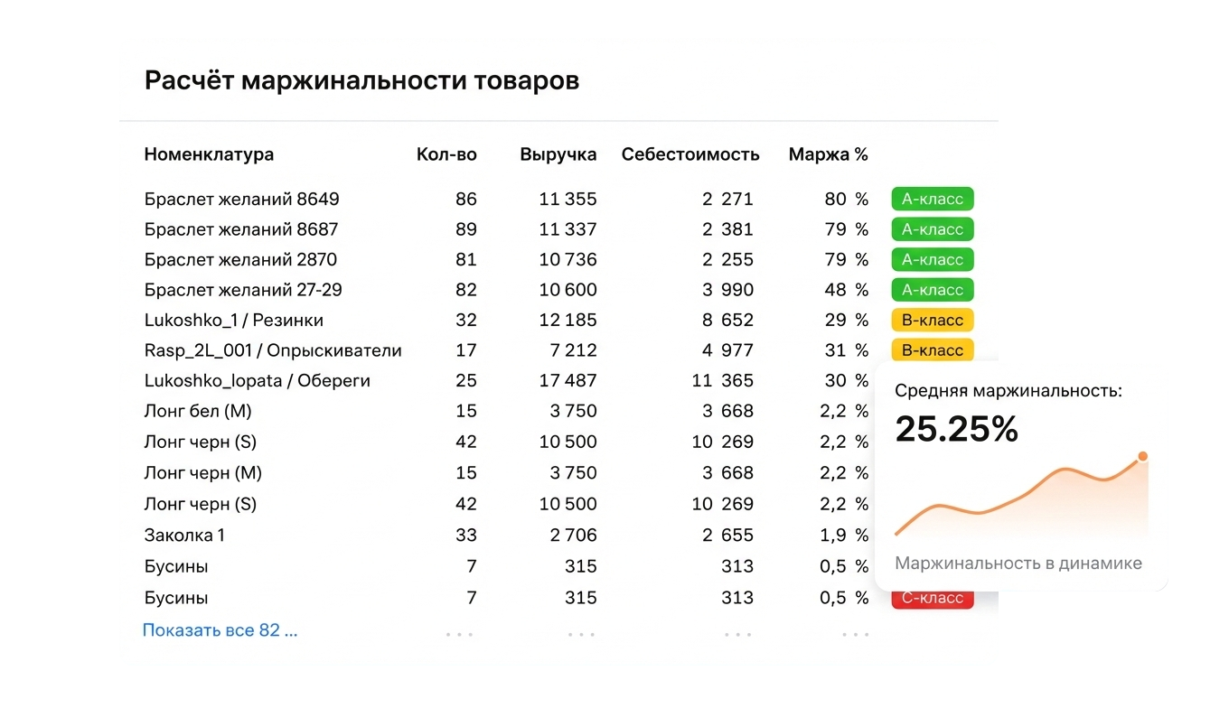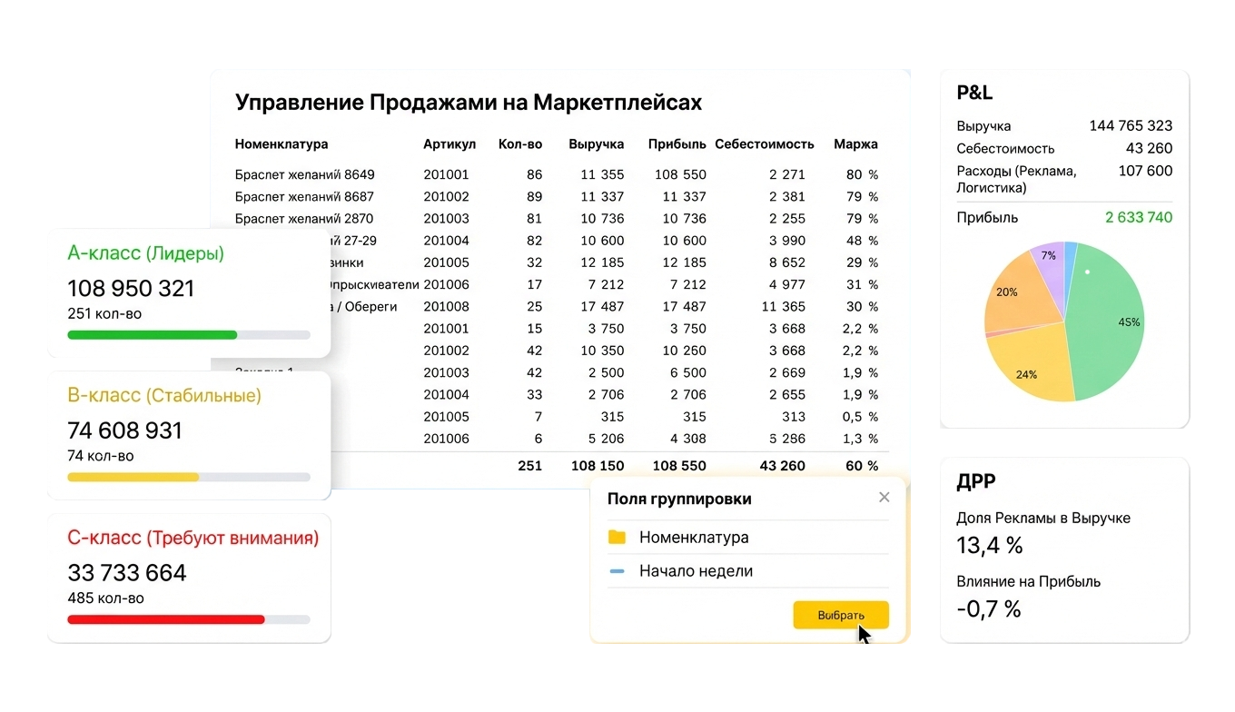 SoykaSoft объединяет продажи, расходы, комиссии и прибыль, предоставляя глубокий ABC-анализ, который позволяет принимать реальные управленческие решения, а не просто смотреть статистику.