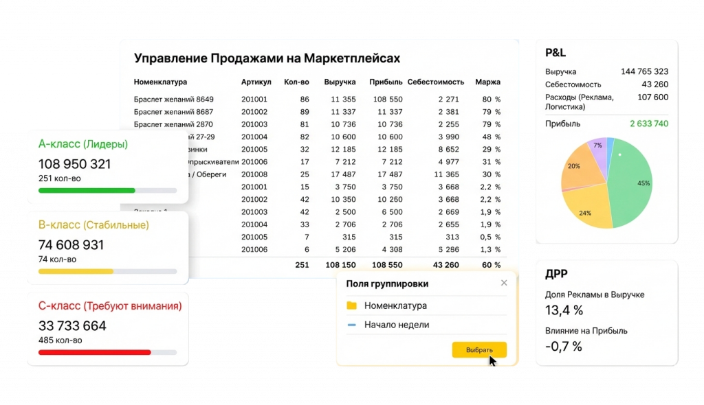 Автоматизация управления на маркетплейсах — это выстраивание финансового и товарного учёта в единой системе. Она позволяет продавцу контролировать остатки, себестоимость, прибыль, расходы и аналитику без ручных таблиц и разрозненных отчётов.