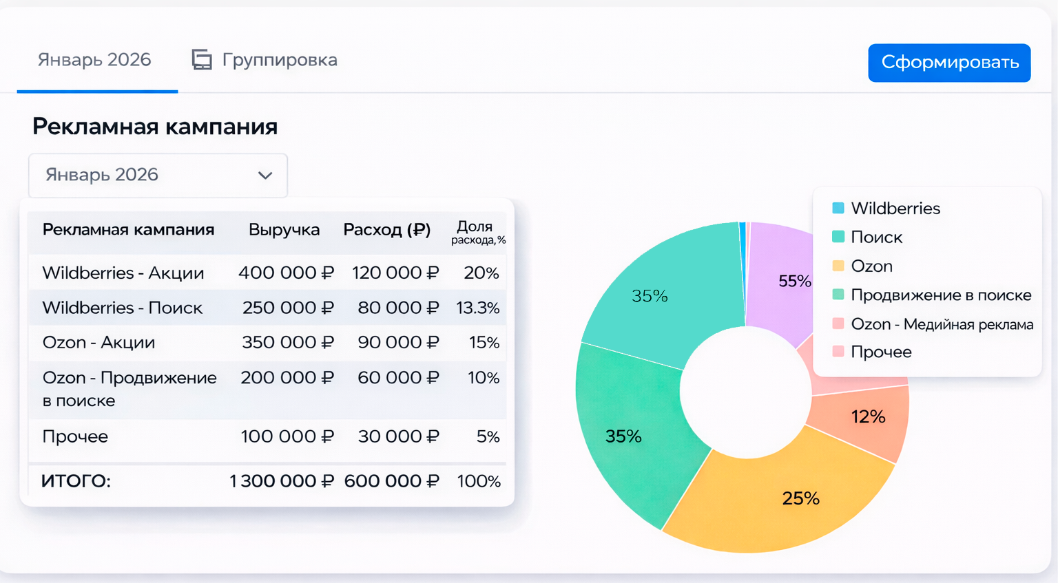 Вы видите реальную картину бизнеса, а не разрозненные цифры из разных кабинетов маркетплейсов. Система учитывает долю рекламы в прибыли для каждой единицы товара