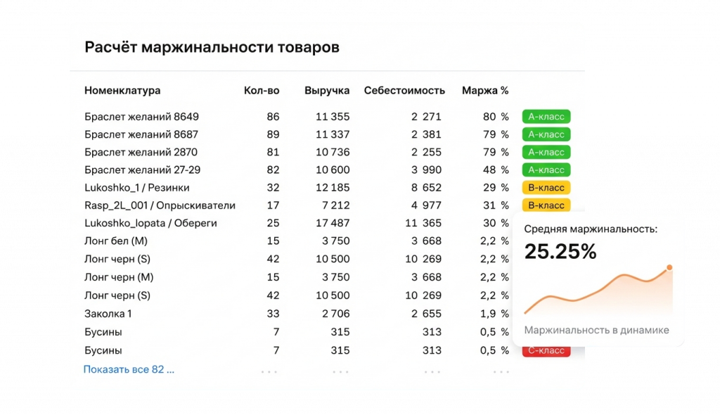 Вы получаете прозрачную картину прибыли, можете быстро выявлять прибыльные и убыточные товары, планировать закупки и продажи, а также оптимизировать ассортимент для увеличения прибыли.