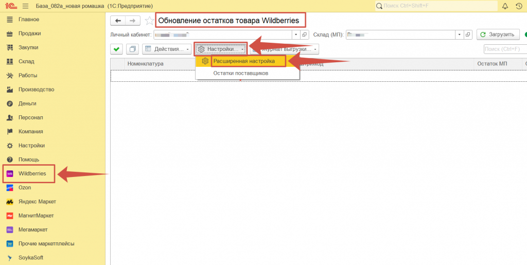 - Обработка “Обновление остатков товара”.В расширенную настройку добавлен учет по номенклатуре маркетплейса. Если номенклатура МП указана, то условие выгрузки остатков действует только на эту позицию, если не указана, то на всю номенклатуру.