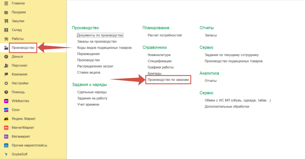 В раздел “Производство” добавлен справочник “Производство по заказам”, в котором указывается список номенклатуры и спецификации, по которым создается документ производства.