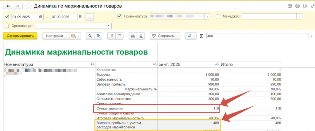 При расчете строки “Валовая прибыль с учетом расходов маркетплейса” теперь учитывается сумма хранения.