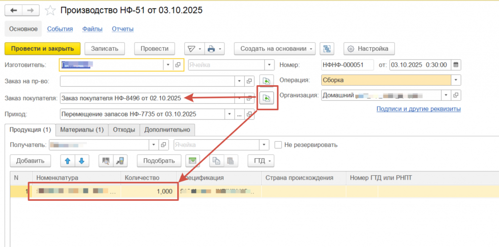 - Документ “Производство”.Добавлена кнопка заполнения табличной части “Продукция” строго по документу “Заказ покупателя”.