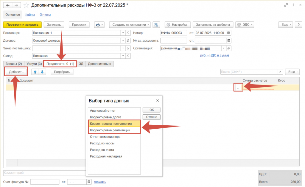 - Документ “Дополнительные расходы”.В табличную часть “Предоплата” в качестве аванса добавлена возможность выбора документа “Корректировка поступления”.