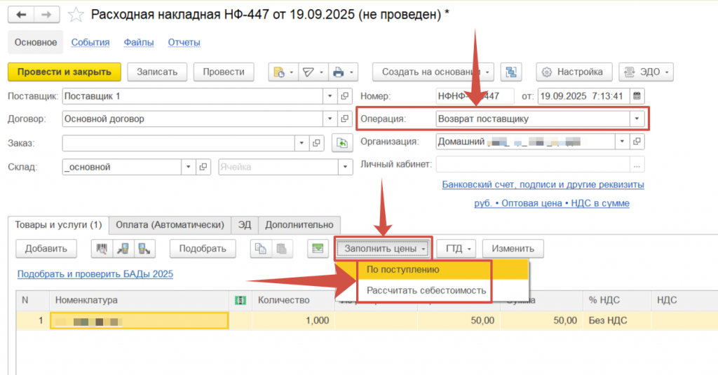 Для операции “Возврат поставщику” добавлена кнопка для заполнения себестоимости: расчетной по складам или из последнего документа поступления.