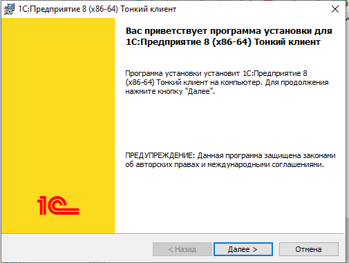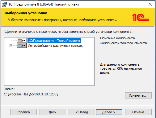 В следующем окне выберите папку, куда установится 1С. По умолчанию программа устанавливается в папку C:\Program Files\1cv8\8.3.18.1208. Нажмите кнопку «Далее».