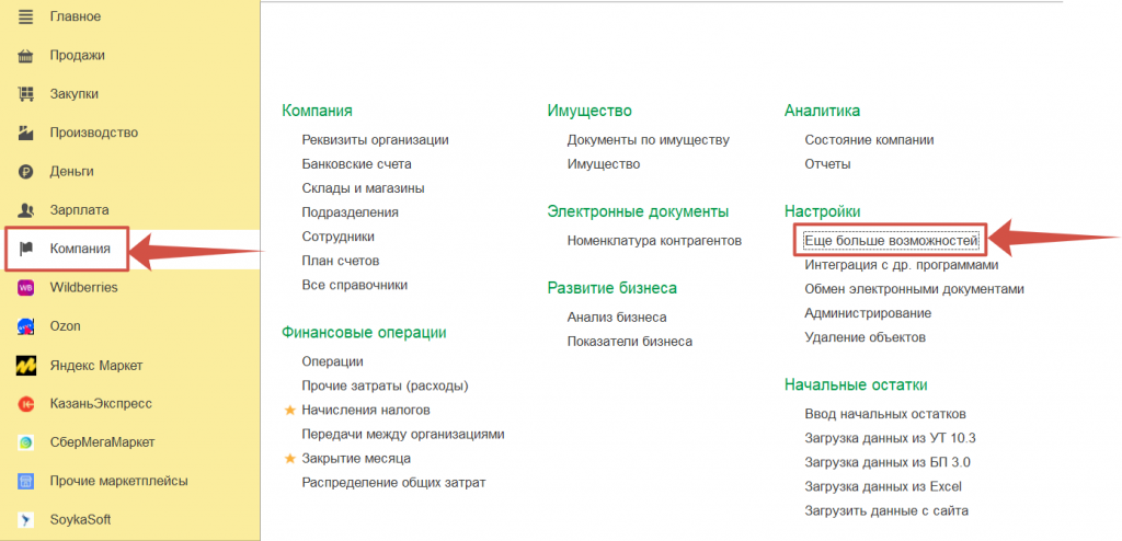 Переходим в раздел Kомпания >> Еще больше возможностей.
