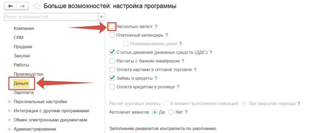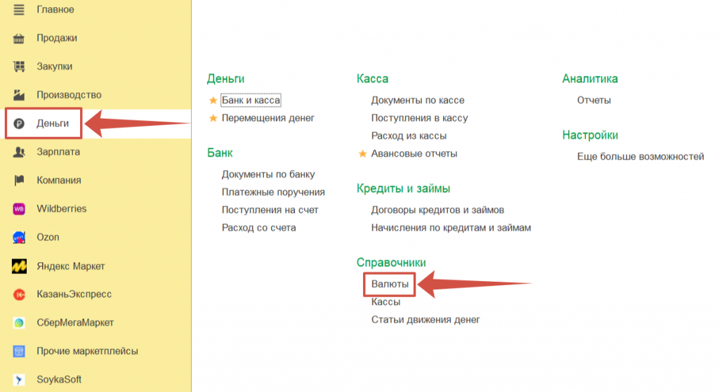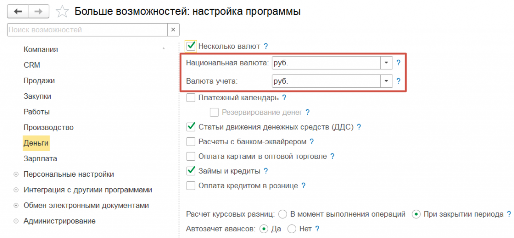 Для начала необходимо проверить настройки программы по работе с валютой.