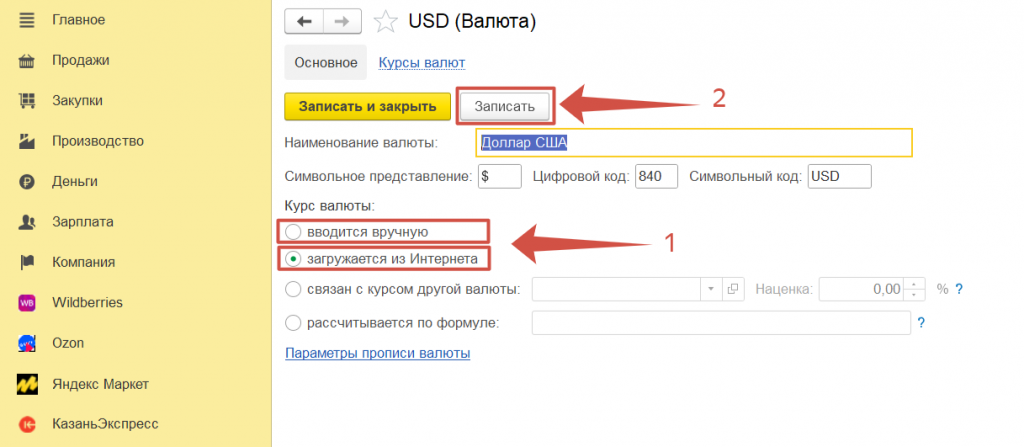 Для автоматической загрузки курсов валют по курсу Центрального Банка РФ необходимо перейти в раздел Деньги >> Валюты >> Нажать кнопку “Загрузить курсы”.