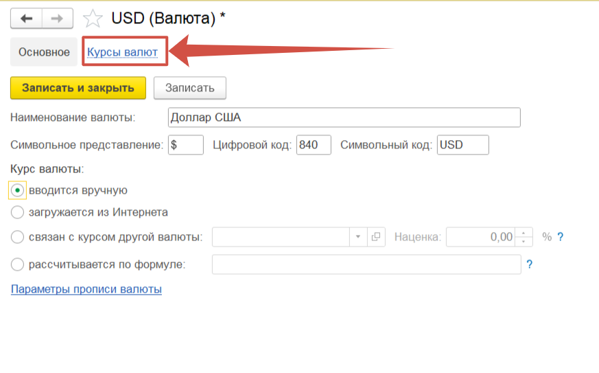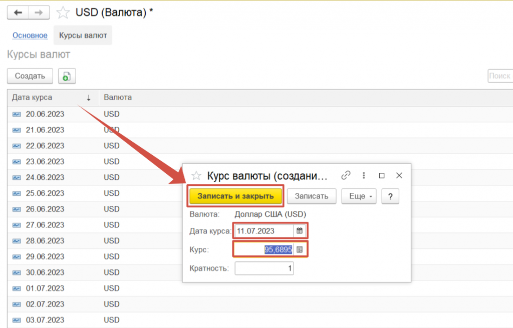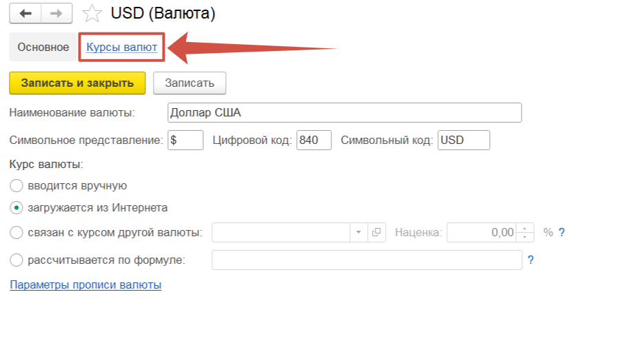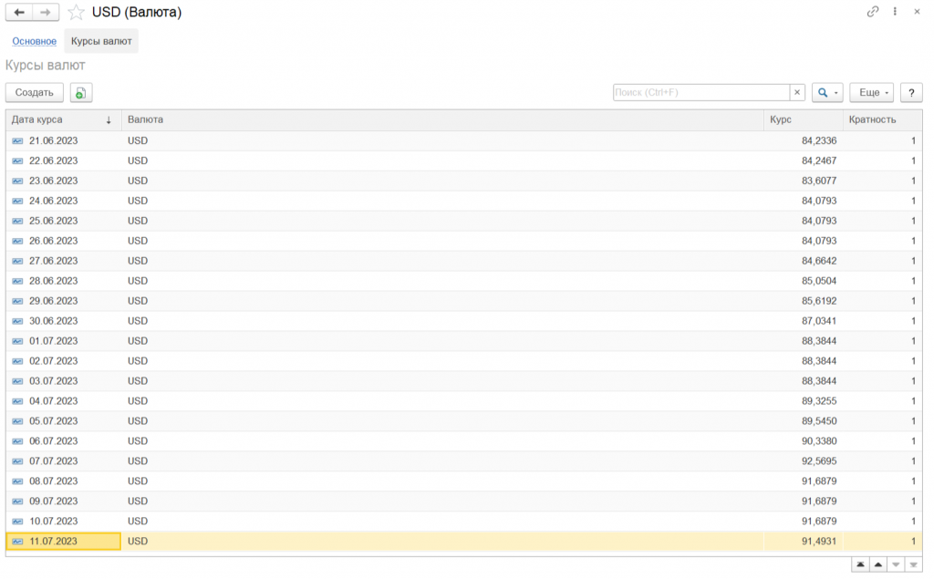 Готово! В карточке валюты во вкладке “Курсы валют” вы можете проверить загруженные данные.