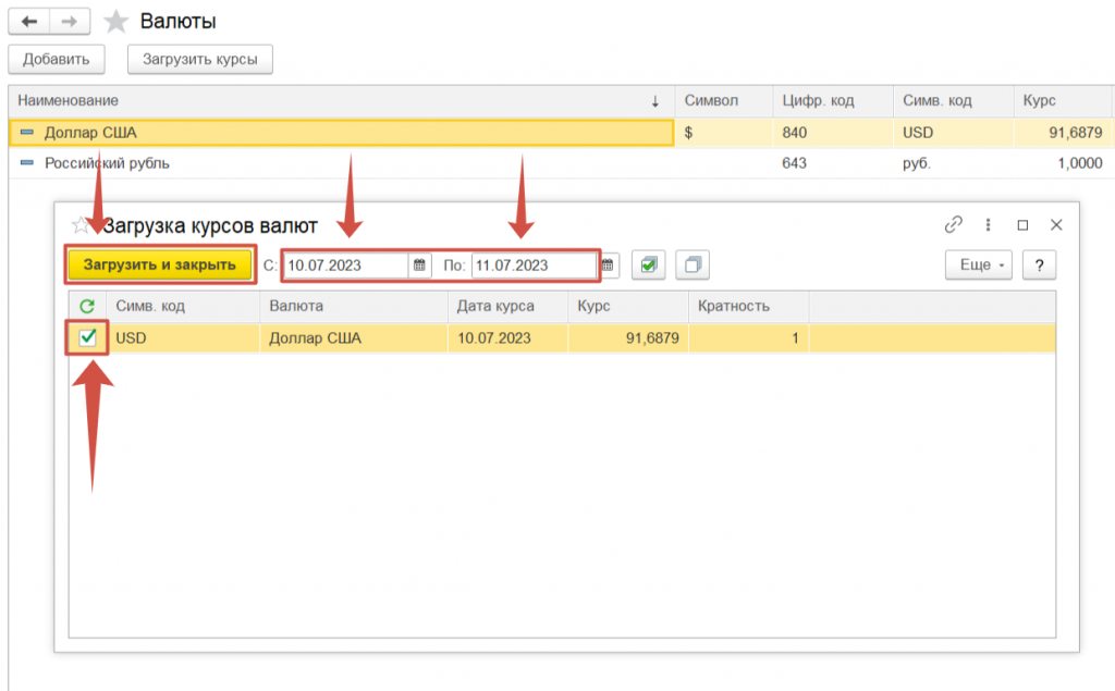 Галочкой выбираем валюты, по которым необходимо загрузить курсы валют;