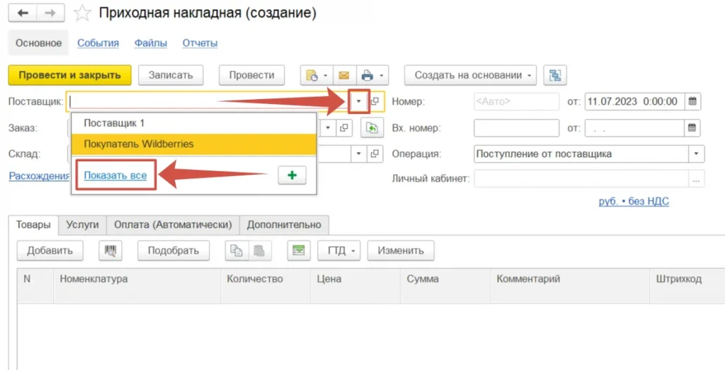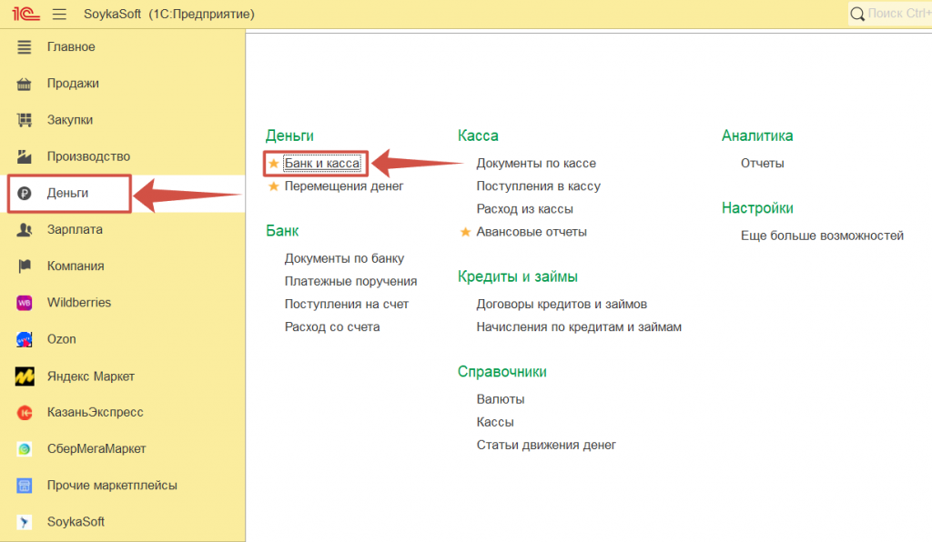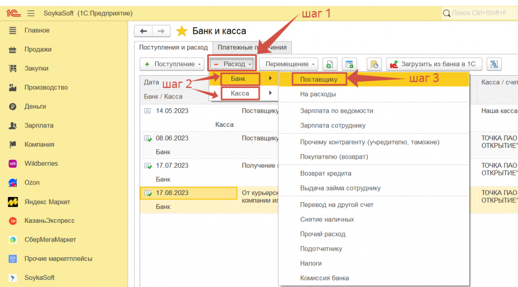 Нажимаем “Расход” >> выбираем Банк или Касса >> операцию выбираем “Поставщику”.