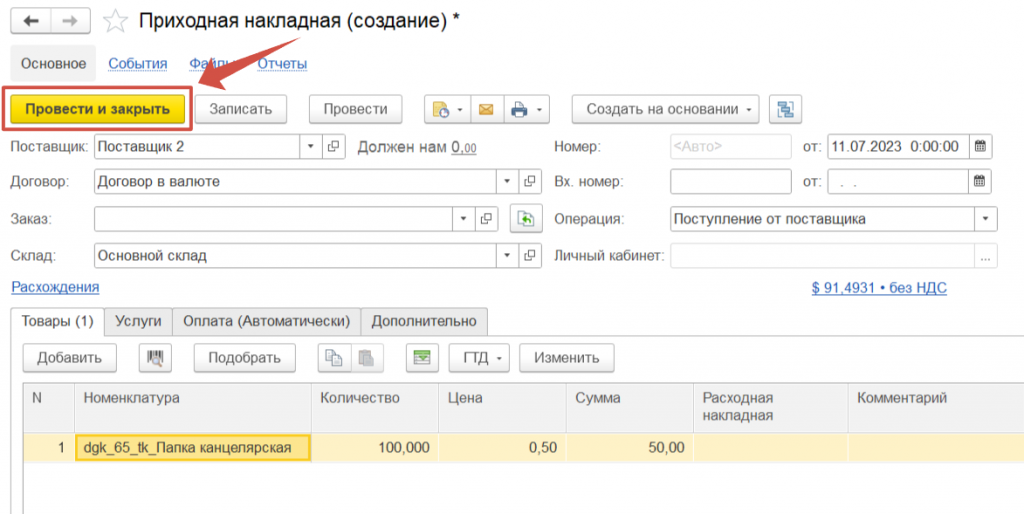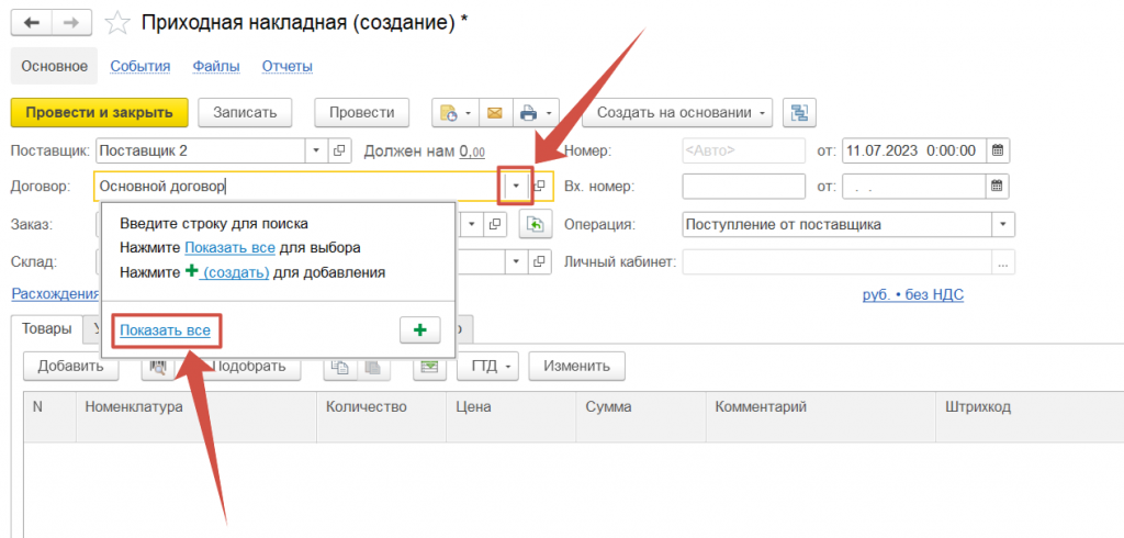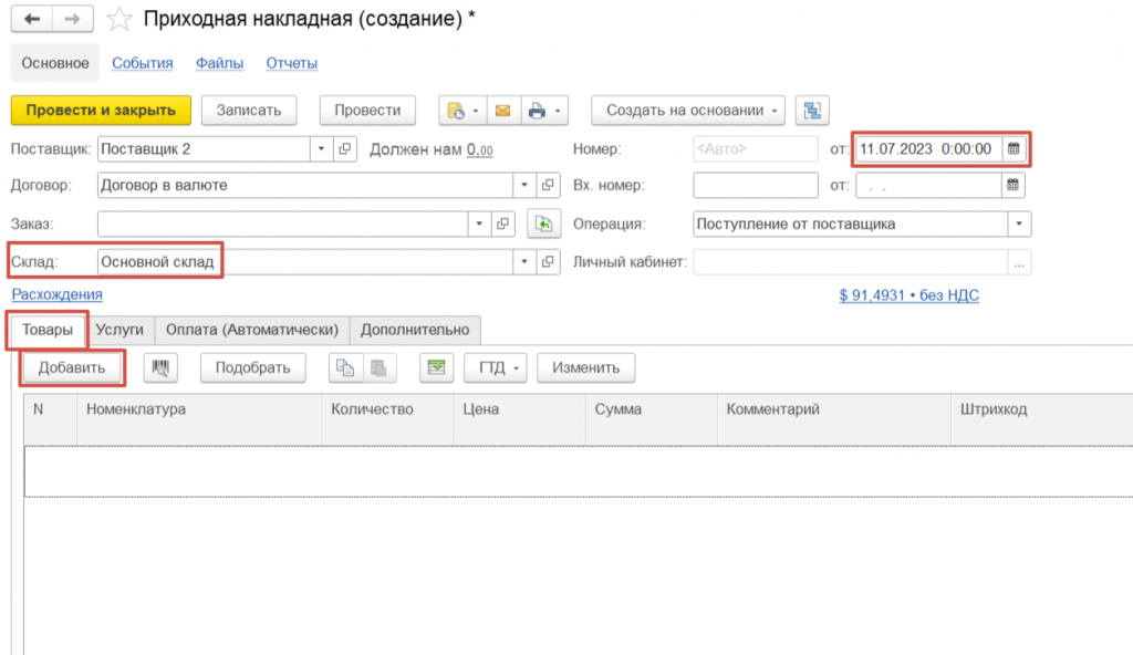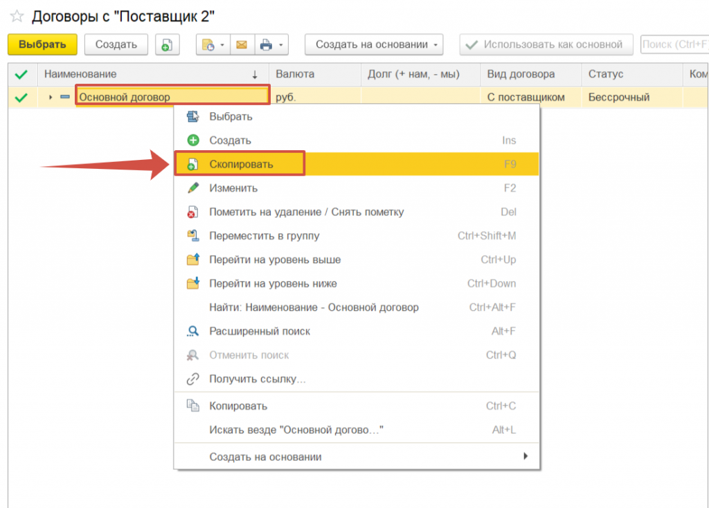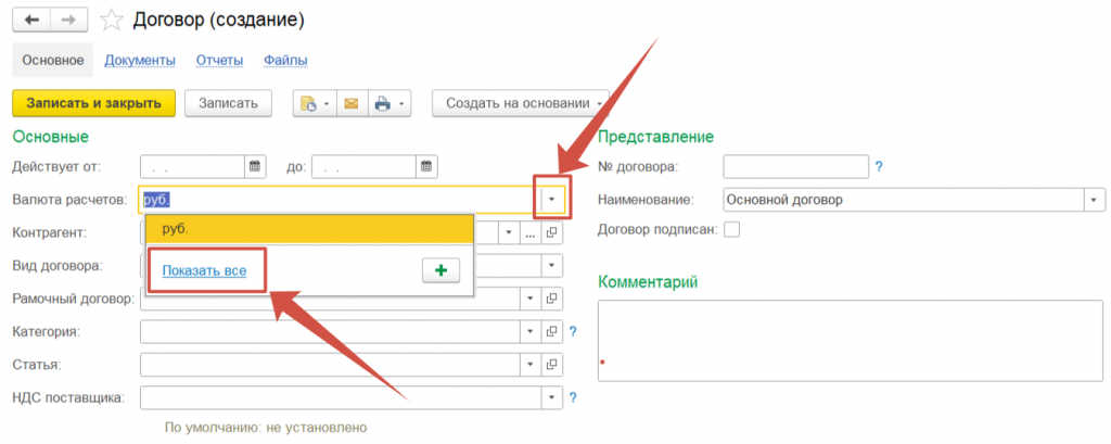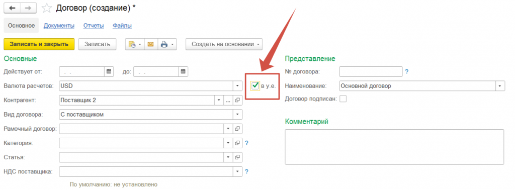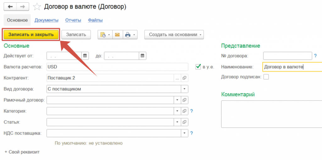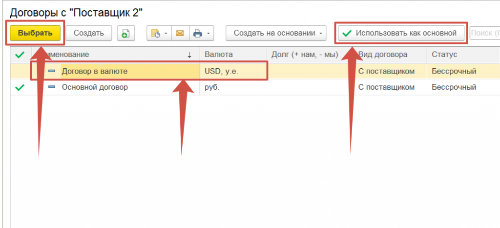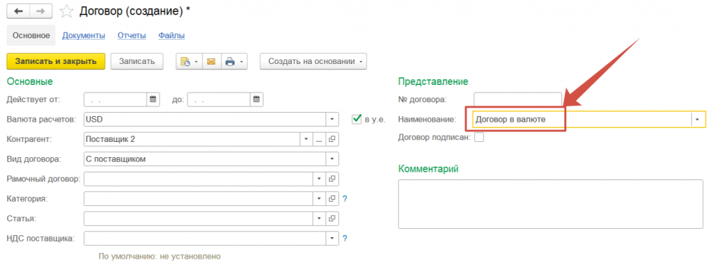 При создании нового поставщика в программе по умолчанию автоматически создается договор с поставщиком в рублях, необходимо будет скорректировать и создать новый договор в валюте.