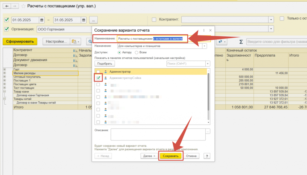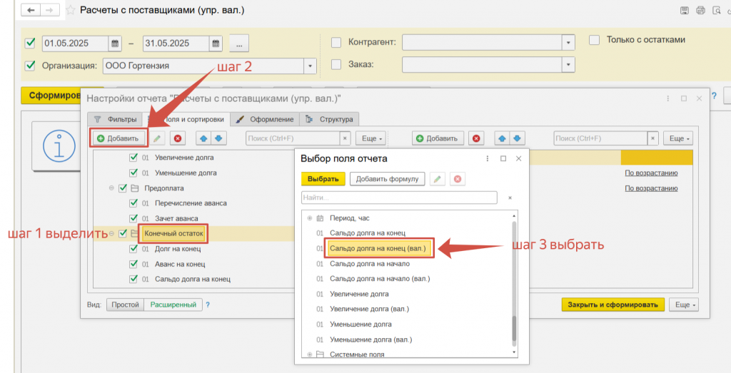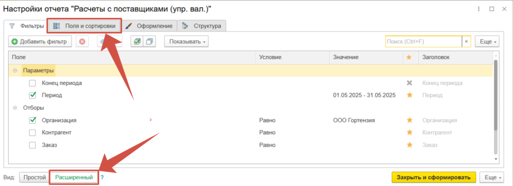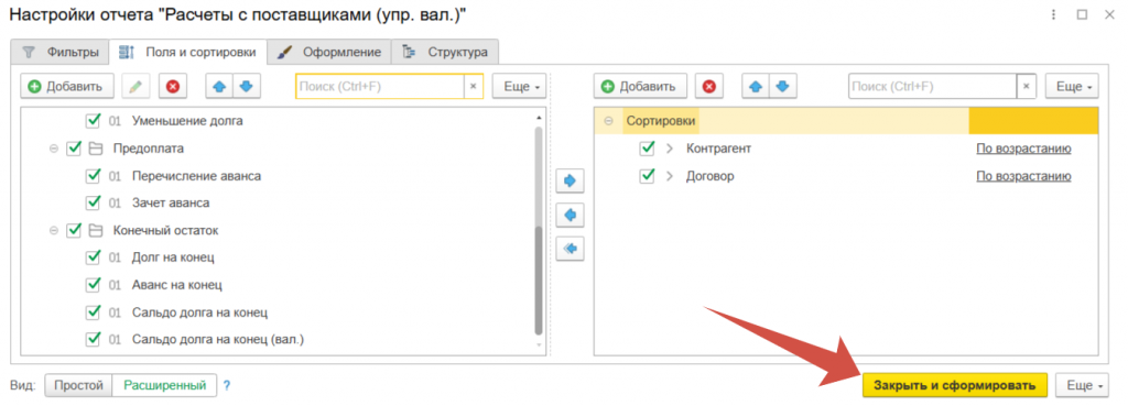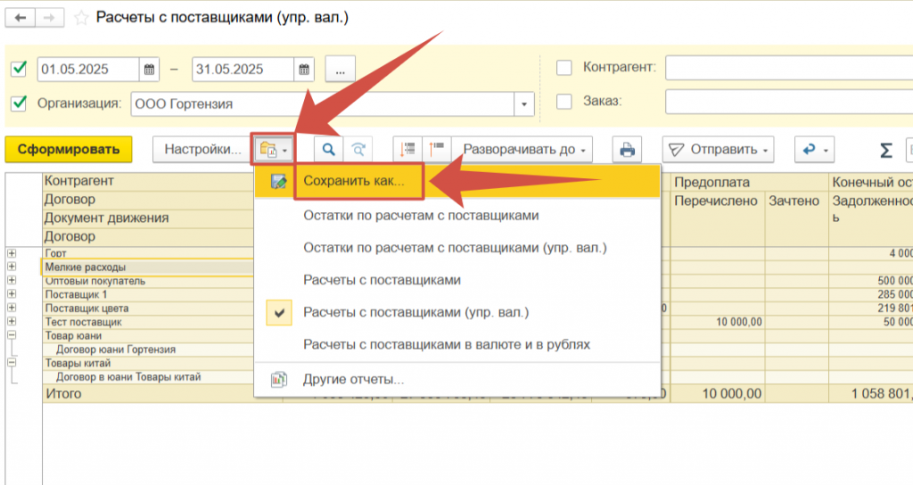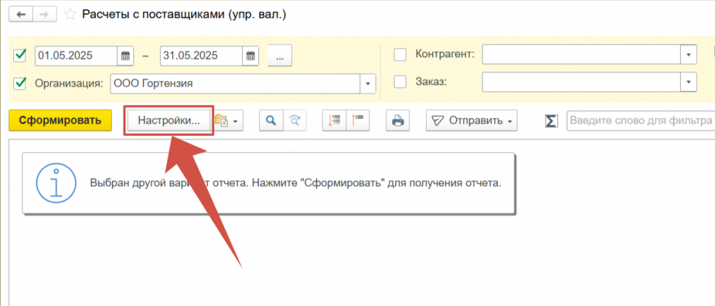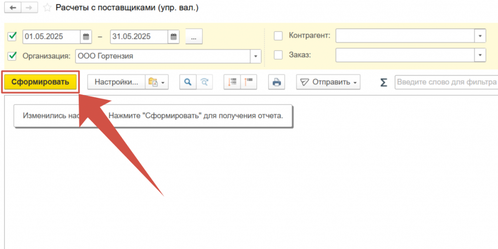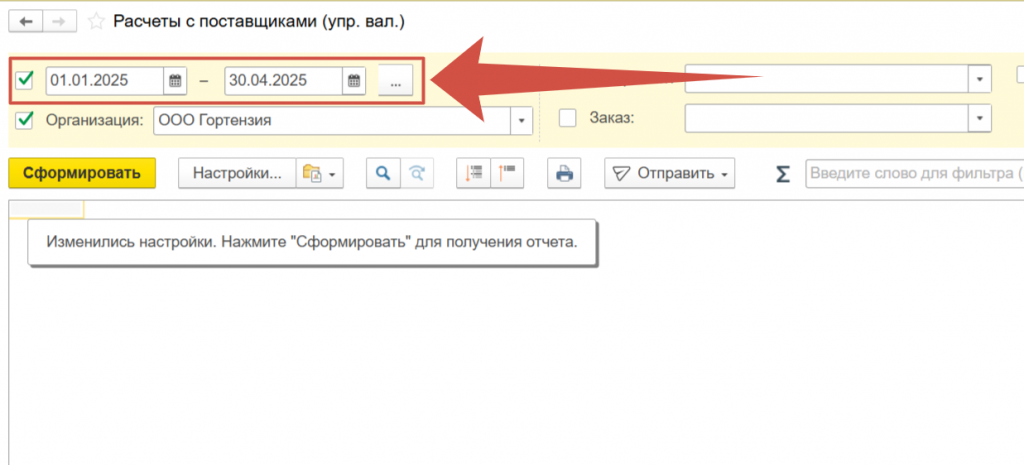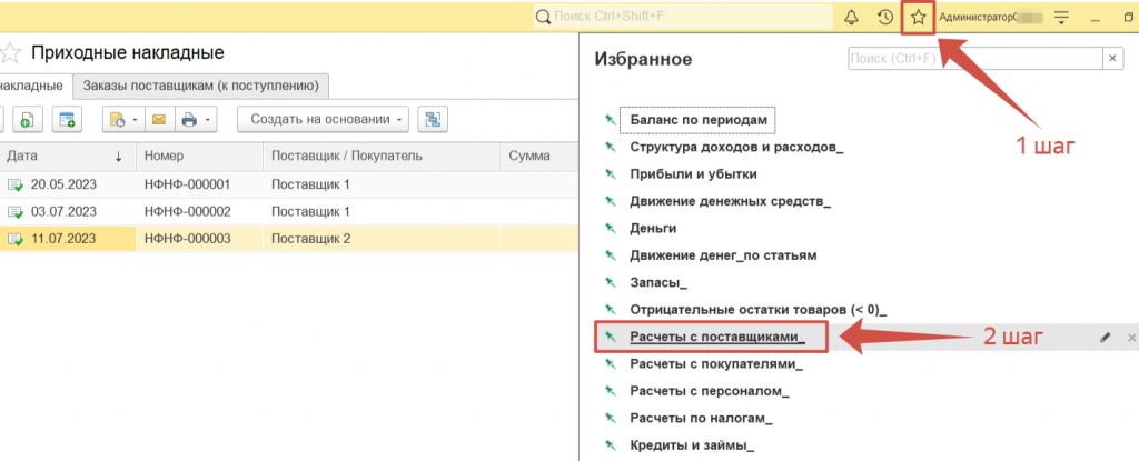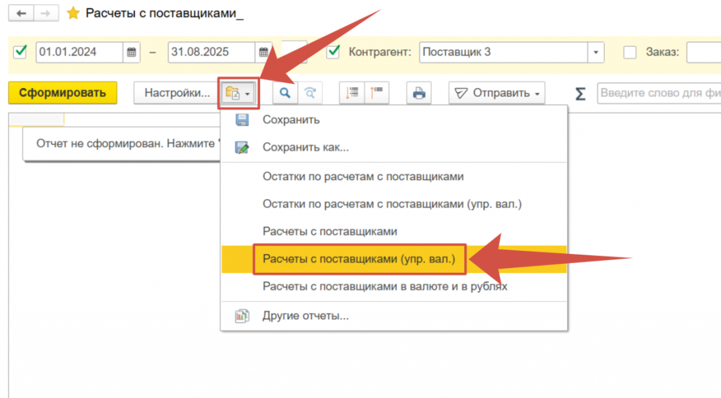Переходим в избранный отчет “Расчеты с поставщиками”.