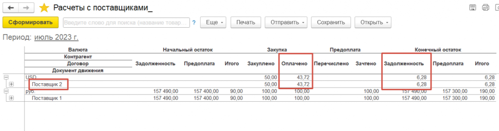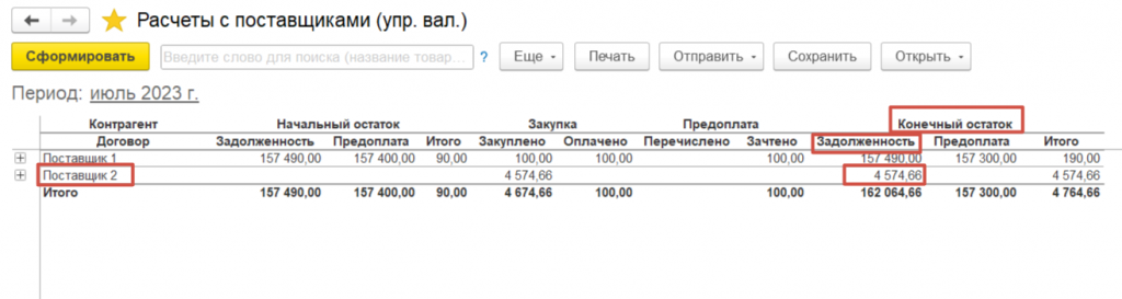 Посмотрим как данная операция отразилась на отчете “Расчеты с поставщиками”
