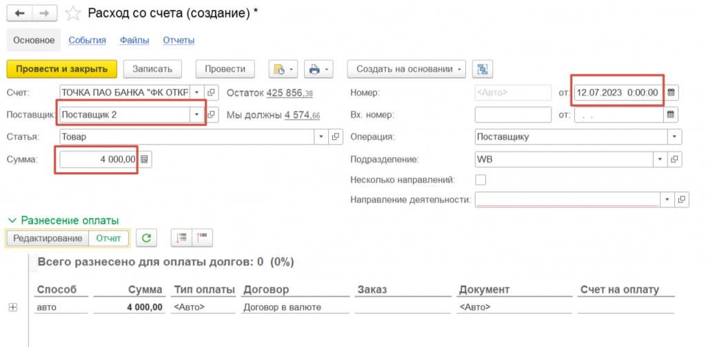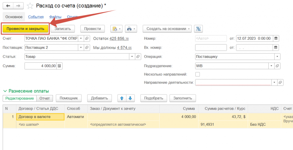 Выбираем Поставщика, оплаченную сумму в рублях, дату платежа.
