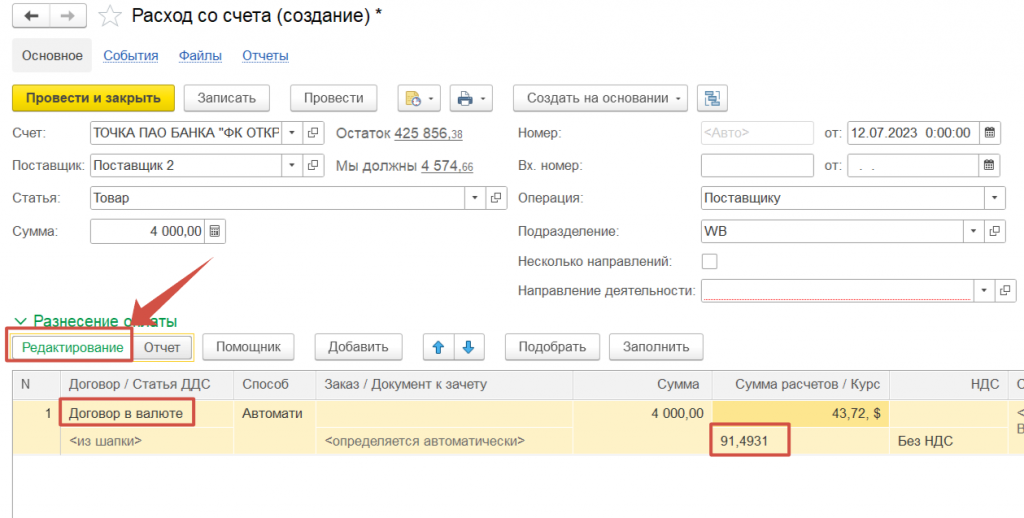 Переходим во вкладку “Редактирование” и проверяем Договор (он должен быть валютным), проверяем курс (он загружается из интернета или вносится вручную в разделе Деньги >> Валюты).