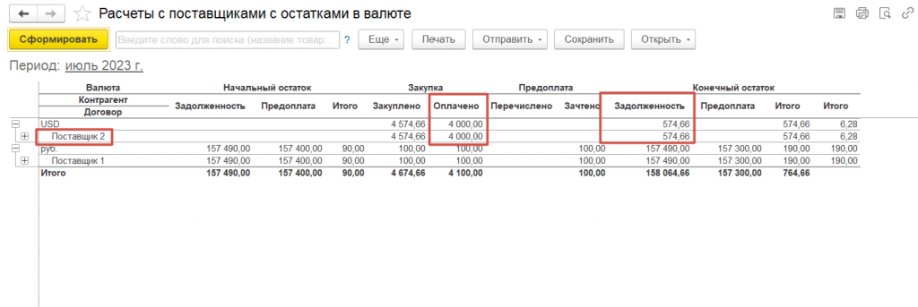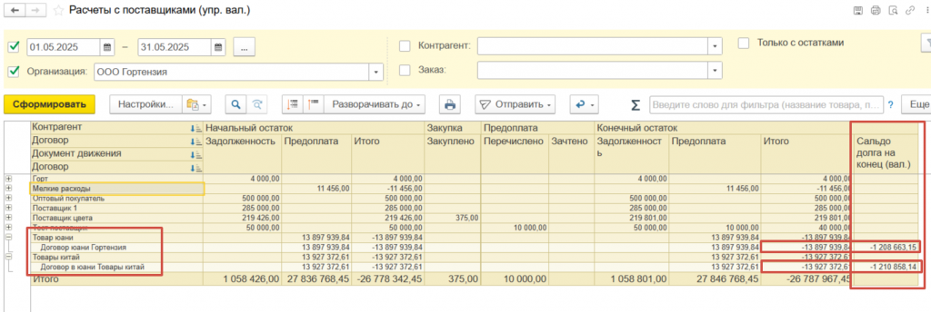 В сформированном отчете мы можем увидеть остаток задолженности или предоплаты в рублях и в валюте.
