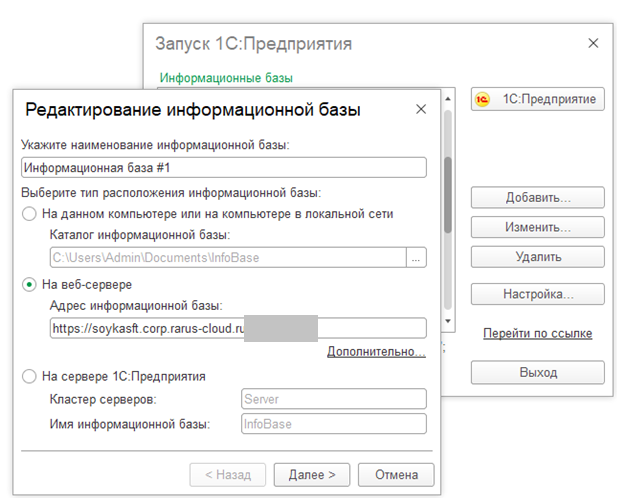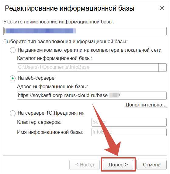 Далее укажите наименование информационной базы. Например «ООО Ромашка». Тип расположения укажите «На веб-сервере». В поле «Адрес информационной базы» укажите адрес, который вам был выслан. И нажмите «Далее»: