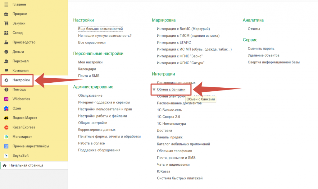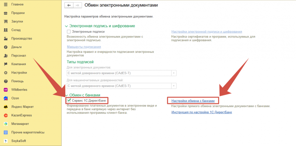 Ставим галочку “Сервис 1С:ДиректБанк”.
