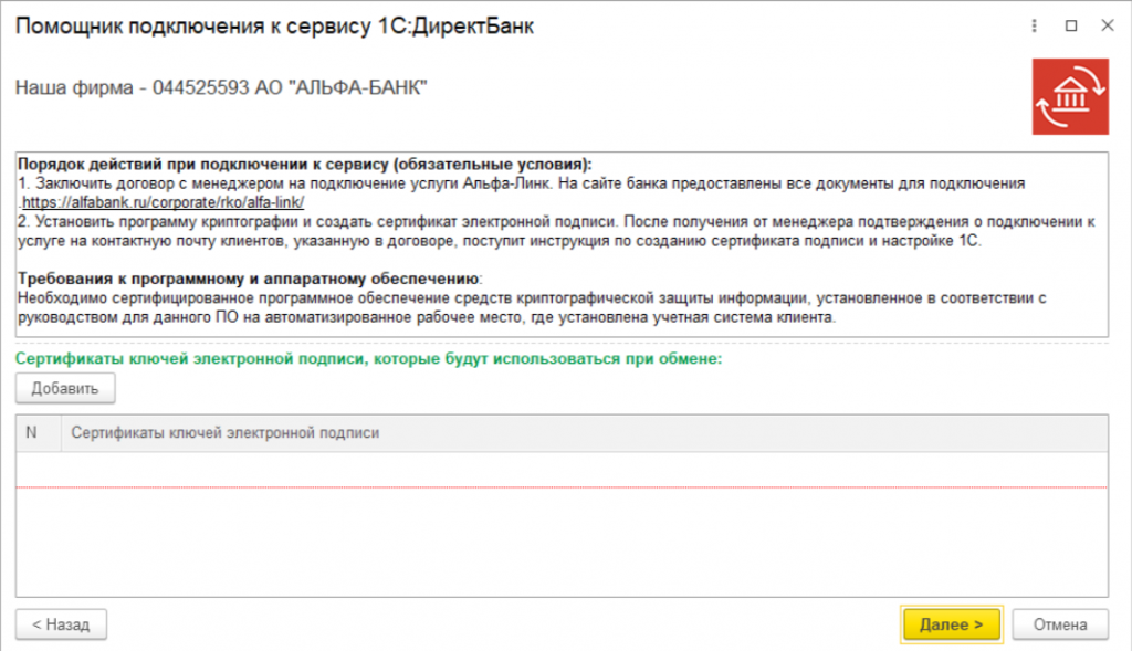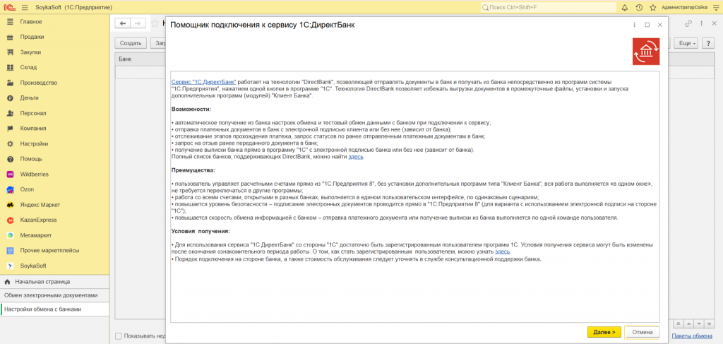 Так как “Сбербанк” поддерживает технологию 1С DirectBank, система определит сценарий подключения и запустит упрощенную версию помощника подключения.