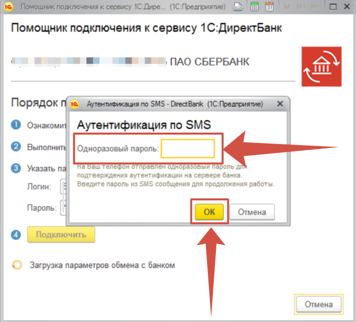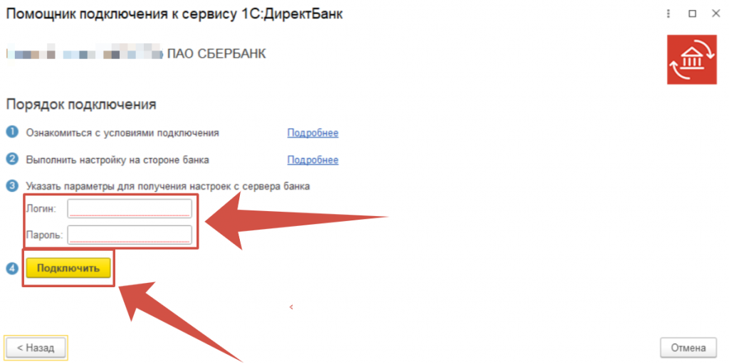 В данном случае в форме помощника подключения потребуется ввести логин и пароль от личного кабинета “Сбербанк Бизнес Онлайн” и нажать кнопку Подключить.