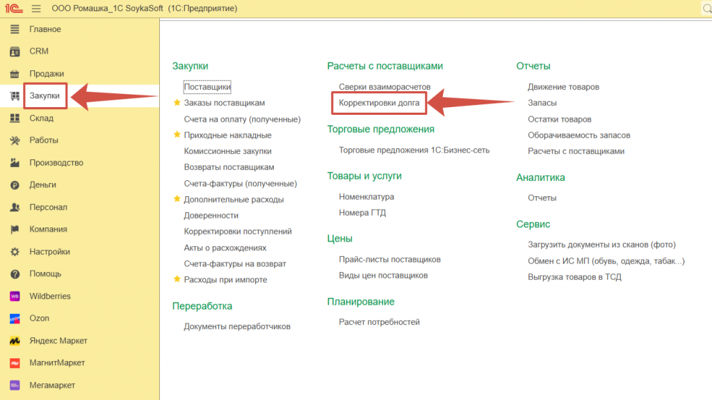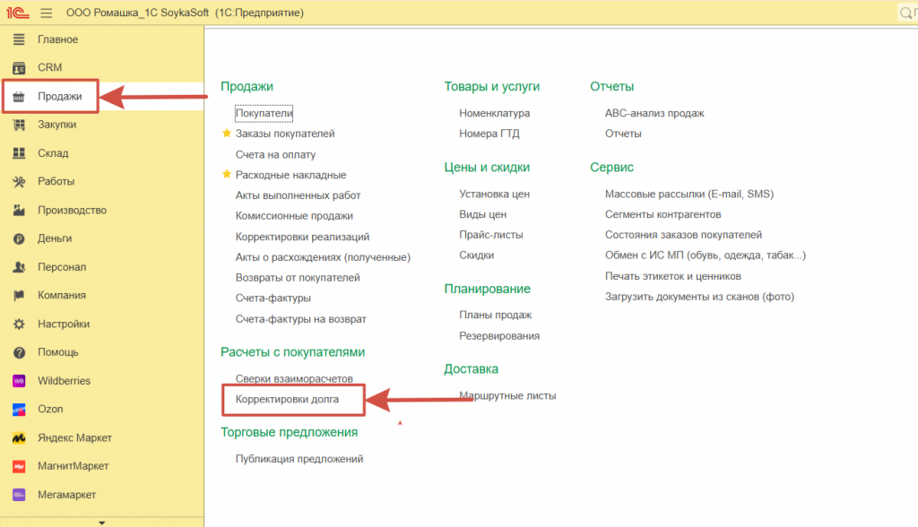 Аналогичным образом при корректировке взаиморасчетов с Покупателями. Например, с Маркетплейсами. Если мы хотим выравнить взаиморасчеты, например по акту сверки с Озон. Нам необходимо зайти в раздел Продажи >> Корректировки долга;