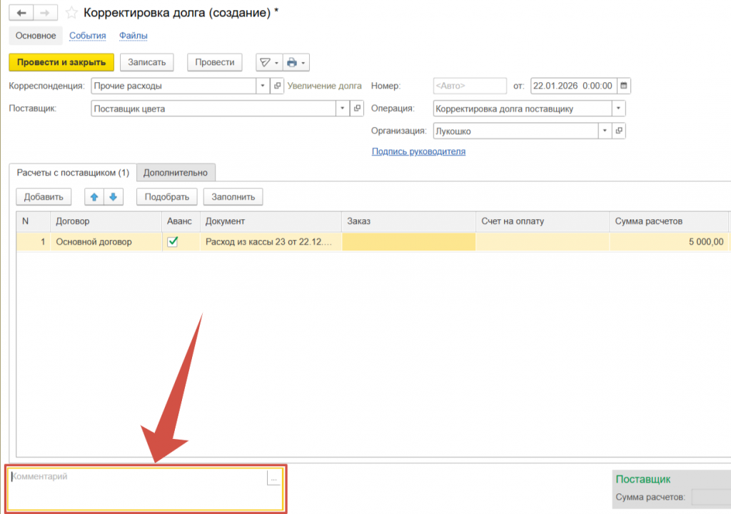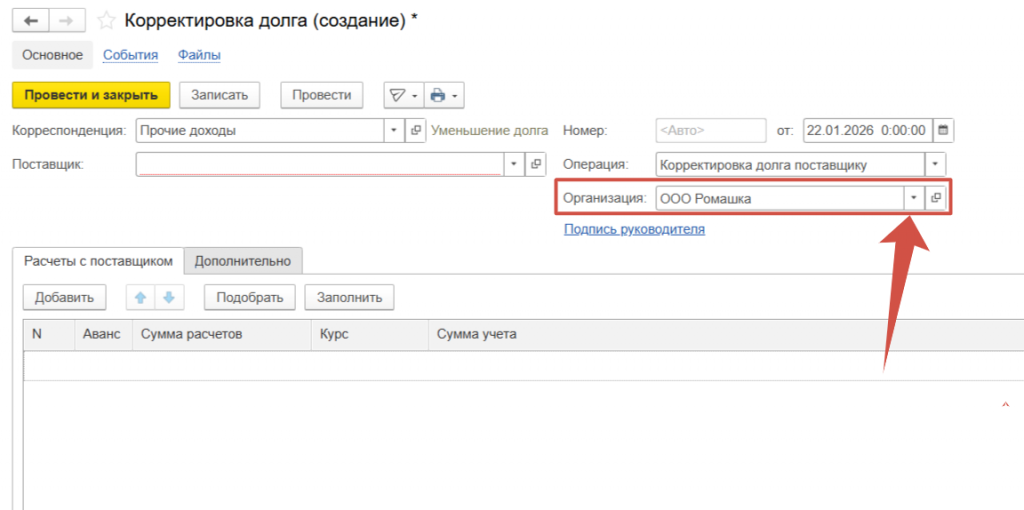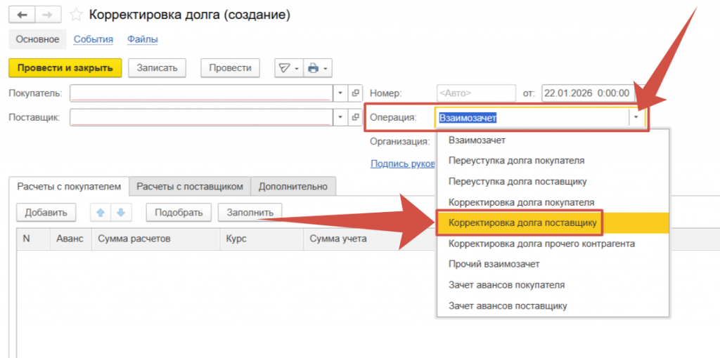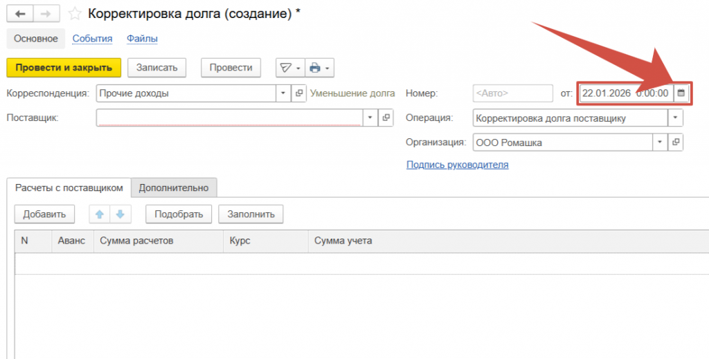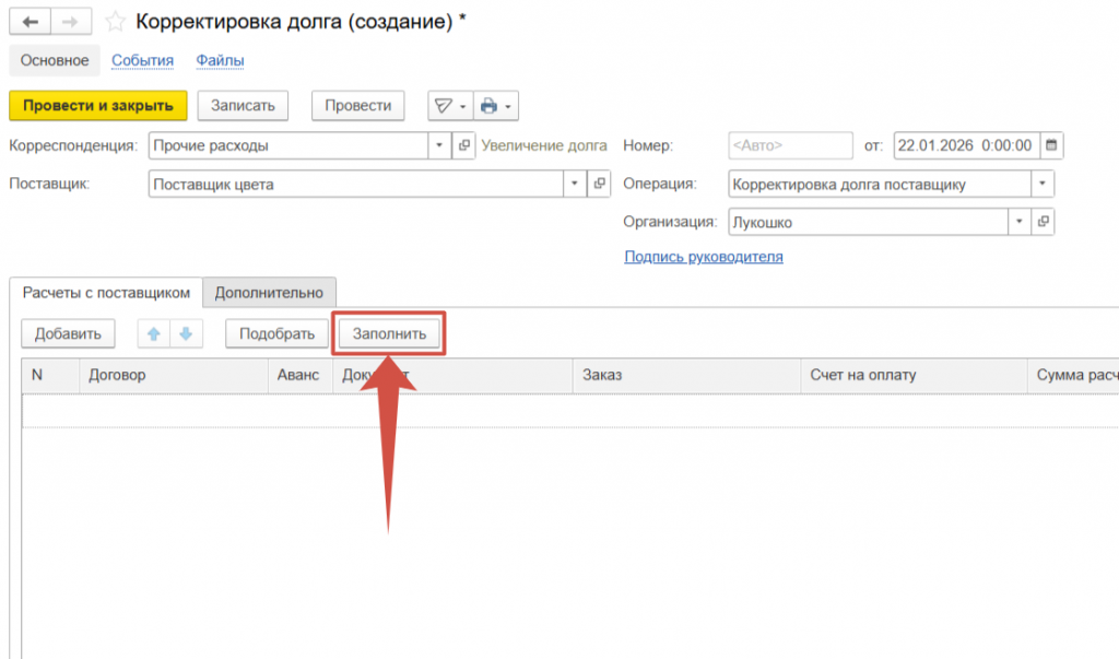 Выбираем Поставщика по которому необходимо скорректировать долг.