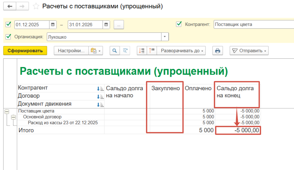 Посмотрим на отчет “Расчеты с Поставщиками”.