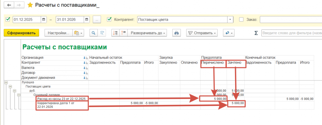 Как видно из отчета документом “Корректировка долга” зачтена предоплата. На конец периода поставщик более не имеет задолженности перед нами.