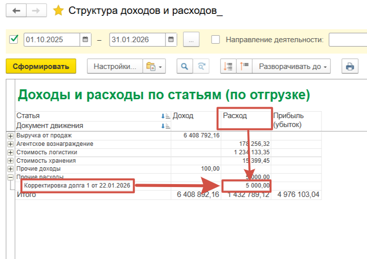 При этом в отчете “Структура доходов и расходов” мы видим, что данным документом сформирован Прочий расход, т.е. на сумму списанной задолженности наша прибыль будет меньше.
