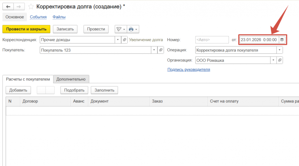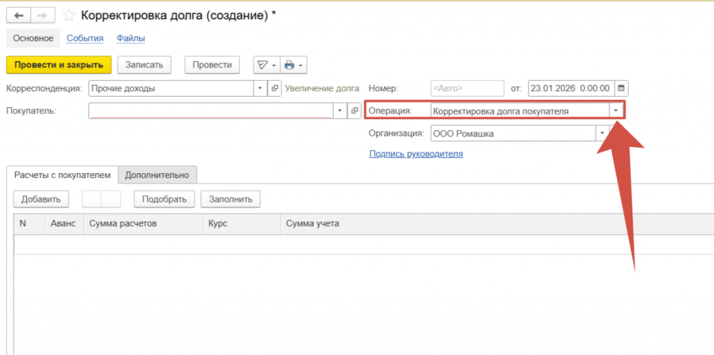 Ошибка была обнаружена уже спустя время, период закрыт. Для того, чтобы выравнить взаиморасчеты обратимся к документу, который называется “Корректировка долга”.