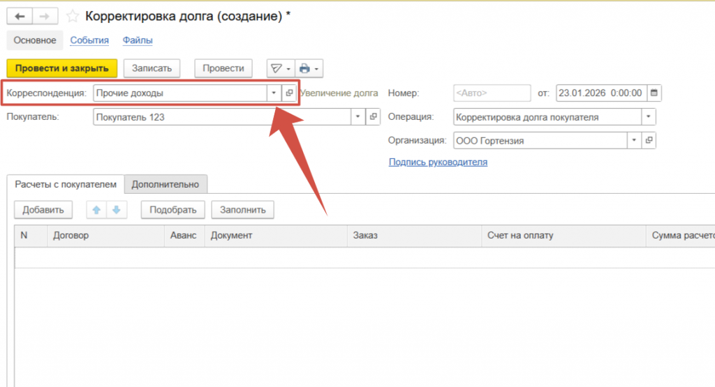 Она сразу подбирает документ, по которому предлагается скорректировать долг.