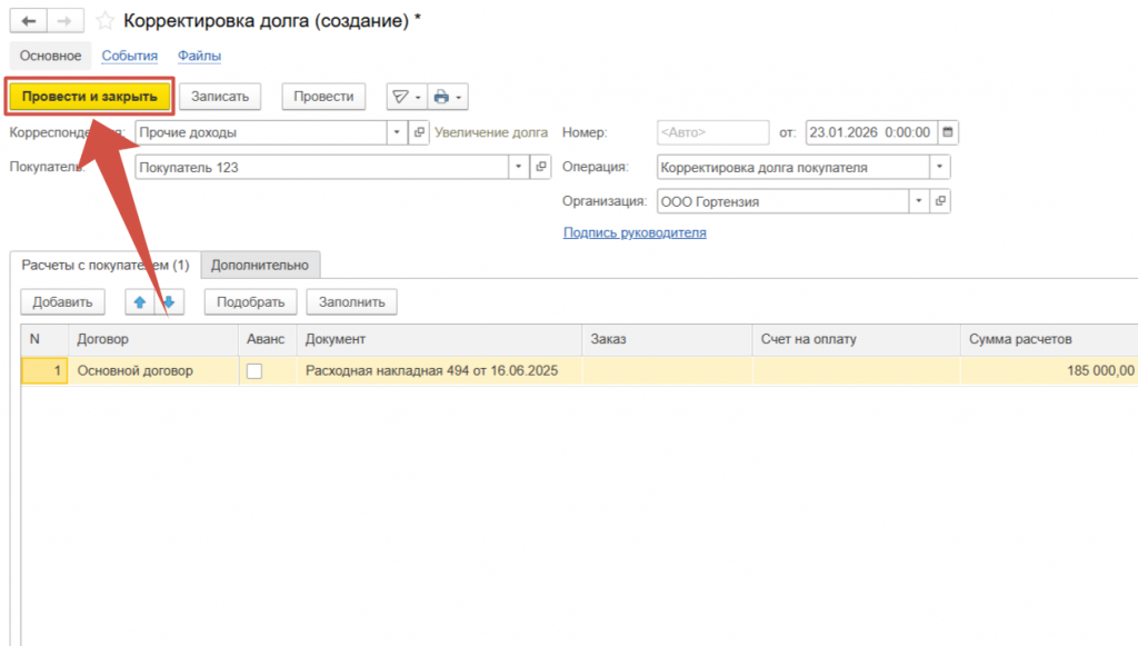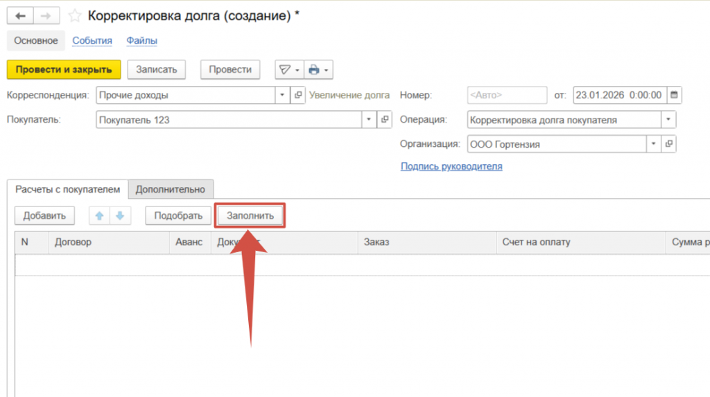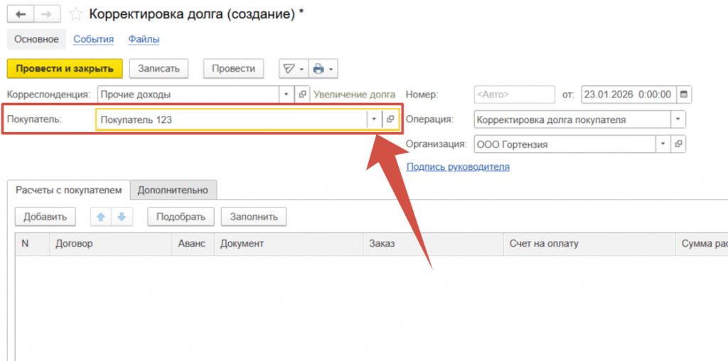 Выбираем Покупателя по которому необходимо скорректировать долг.