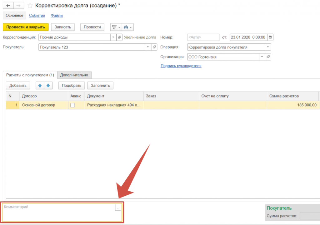 При необходимости можно добавить комментарий, чтобы указать причину списания задолженности.