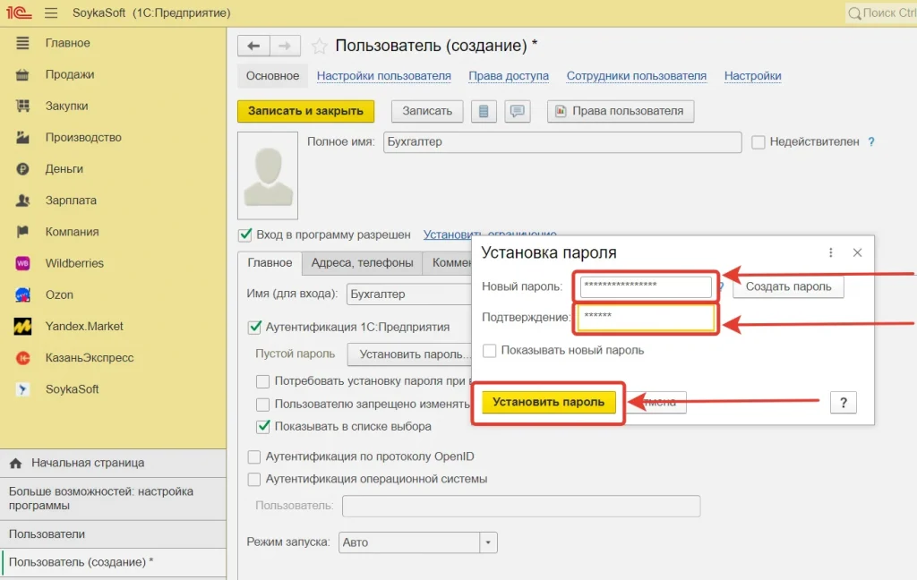 В появившемся окне необходимо прописать Пароль для нового пользователя дважды, в поле «Новый пароль» и в поле «Подтверждение», далее нажать кнопку «Установить пароль».