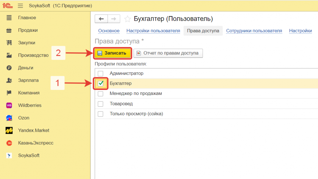 Необходимый «Профиль пользователя» отмечаем галочкой. Нажимаем кнопку «Записать».