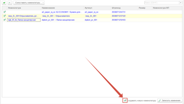 то , необходимо просто поставить галочку “Создавать новую номенклатуру” и нажать кнопку “Записать изменения”
