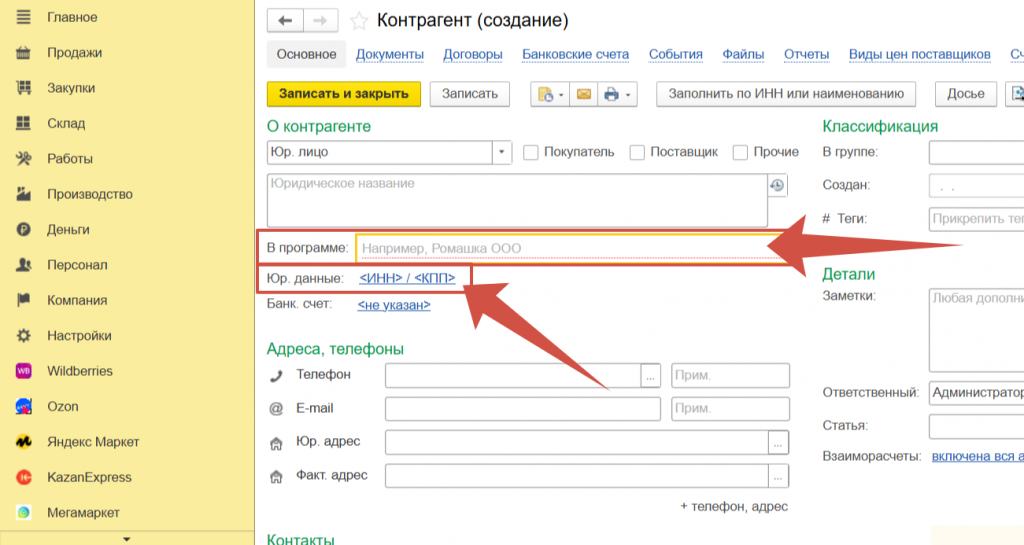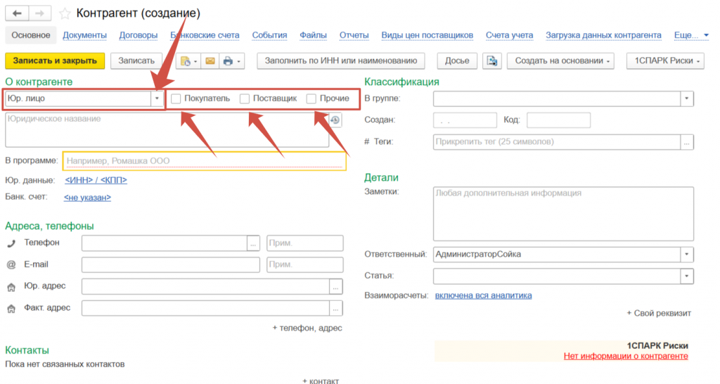 Выбираем вид контрагента: Юр.лицо, физ.лицо или ИП.