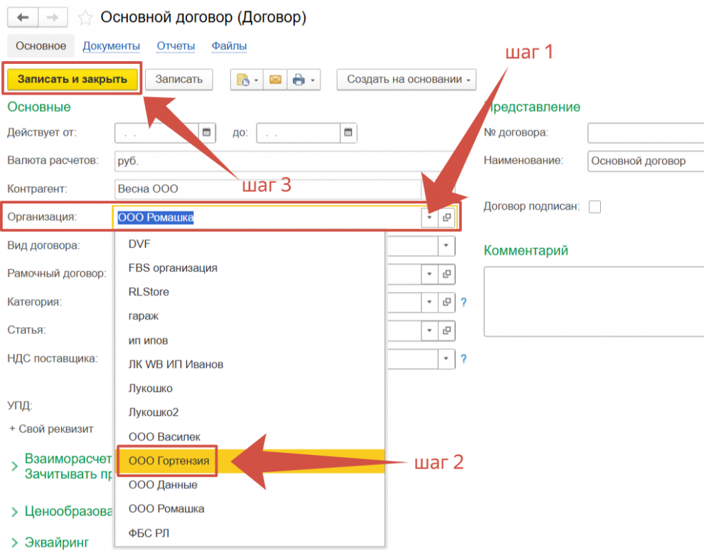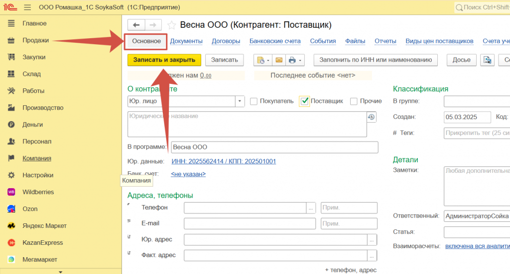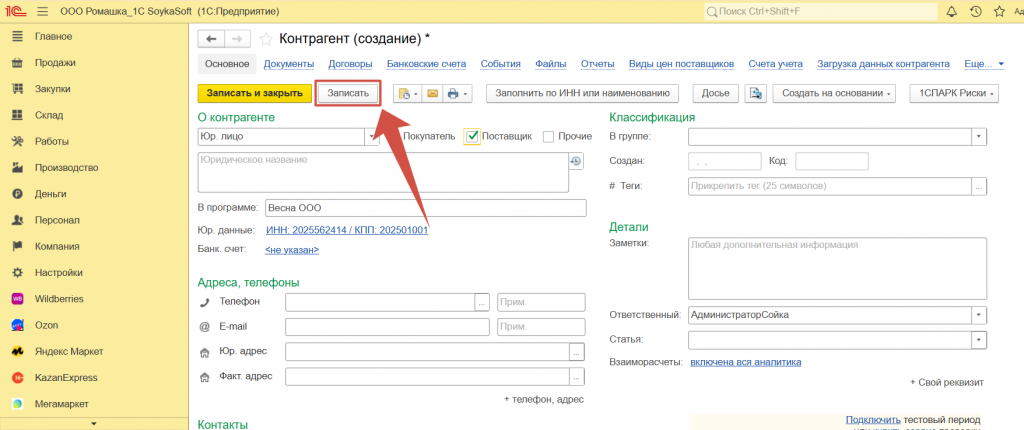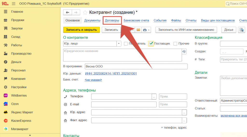 Далее прописываем наименование контрагента – здесь можно использовать разговорное наименование.