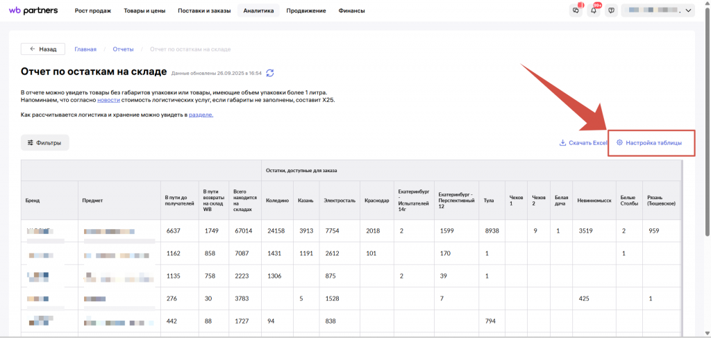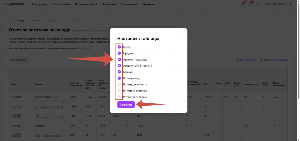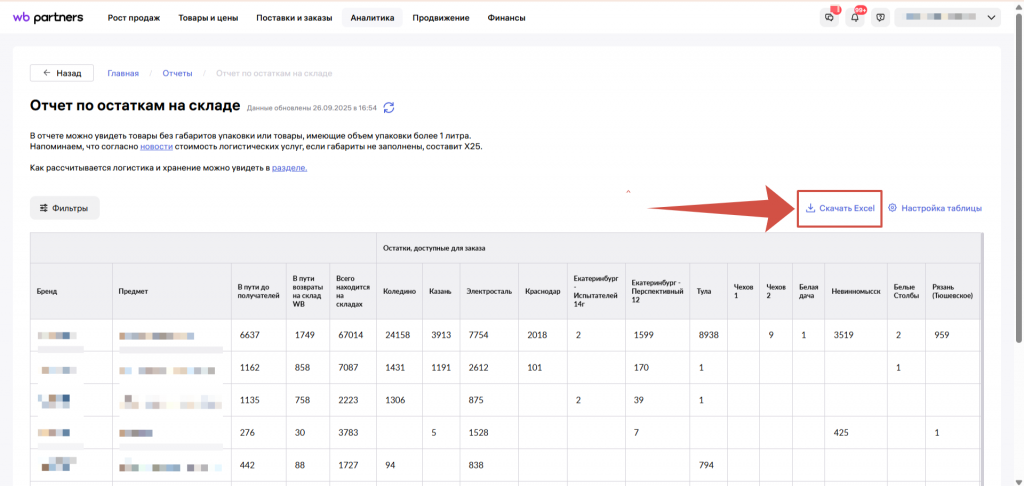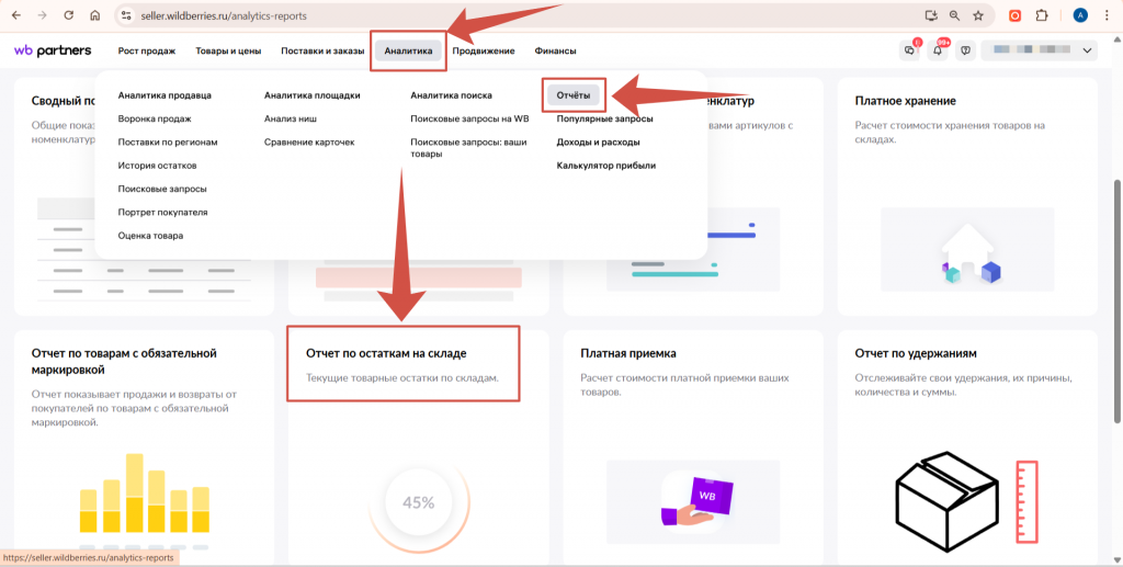 Для выгрузки остатков по WB, заходим на seller.wildberries.ru >> Раздел “Аналитика” >> “Отчеты” >> “Отчет по остаткам на складе”.