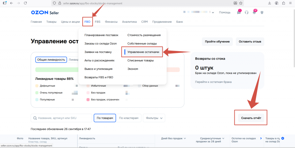 Для выгрузки остатки товаров, хранящихся на маркетплейсе OZON необходимо зайти на сайт seller.ozon.ru >> FBO >> Управление остатками >> Скачать отчет.