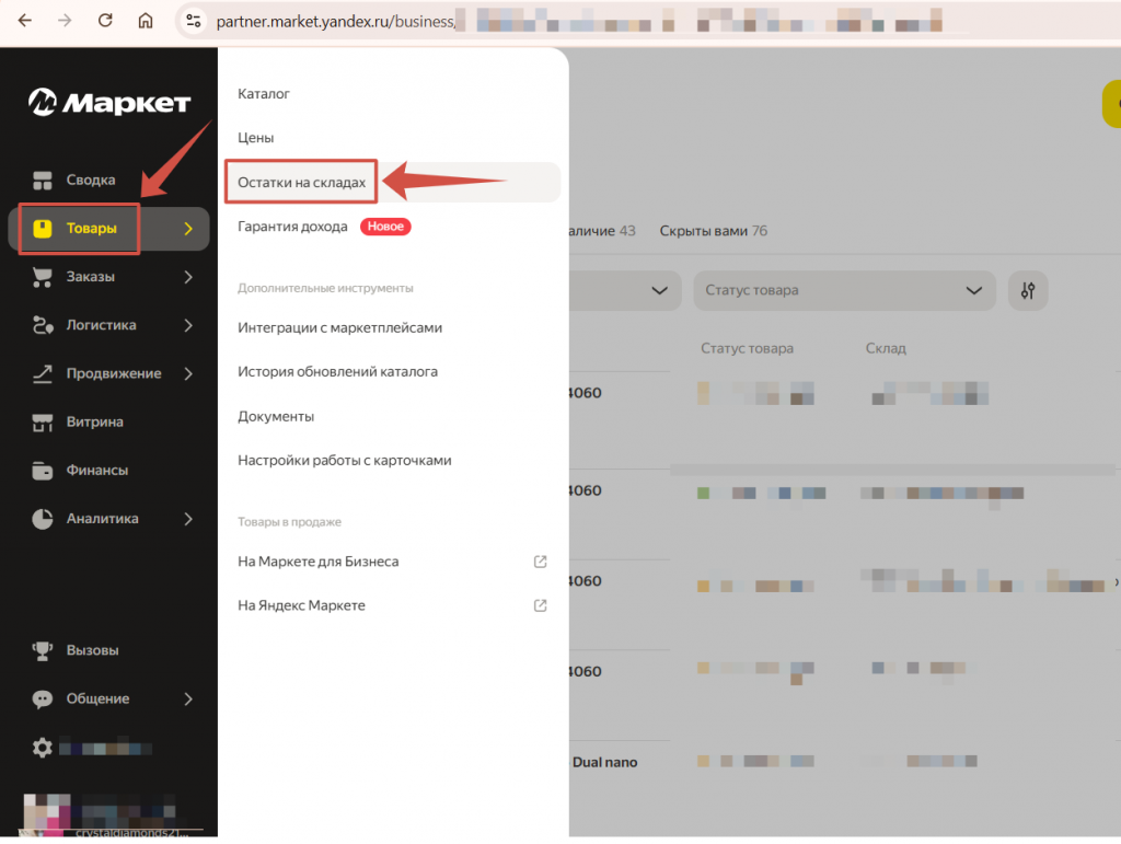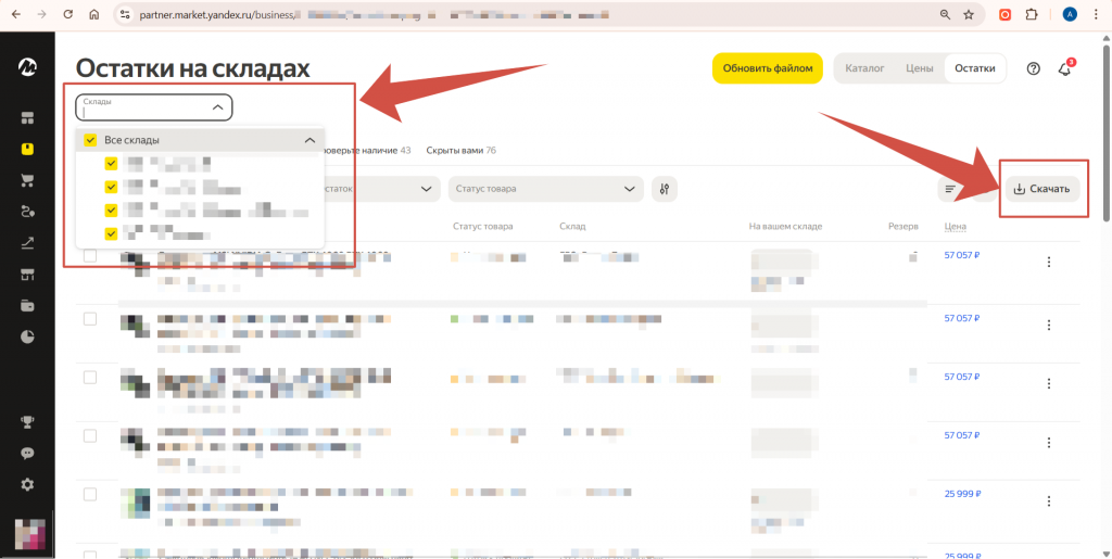 Для выгрузки остатков необходимо зайти на сайт partner.market.yandex.ru >> Раздел Товары >> Остатки на складах >> Выбираем необходимый склад >> Нажимаем “Скачать”.