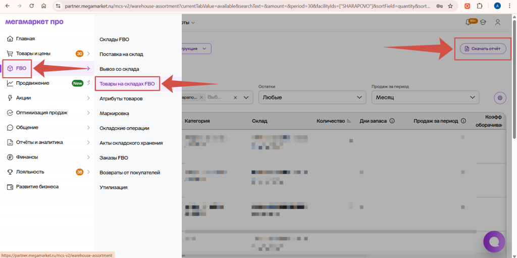 Далее рассмотрим как выгрузить остатки товаров, хранящихся на маркетплейсе МегаМаркет.