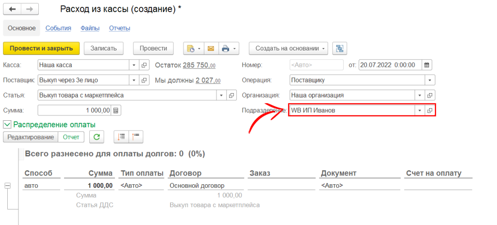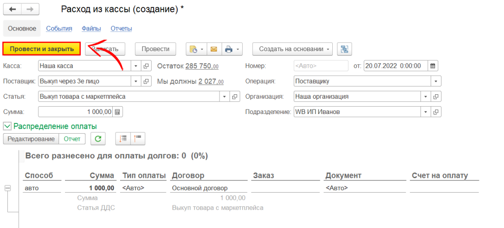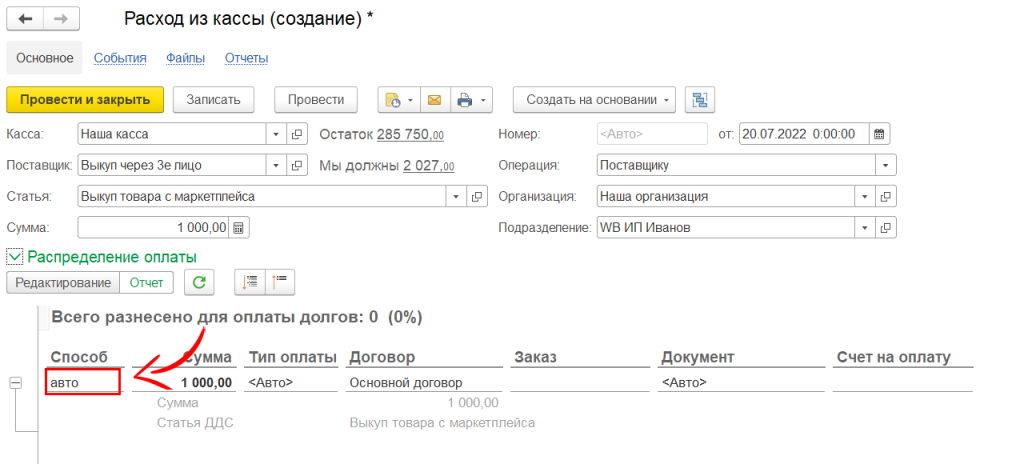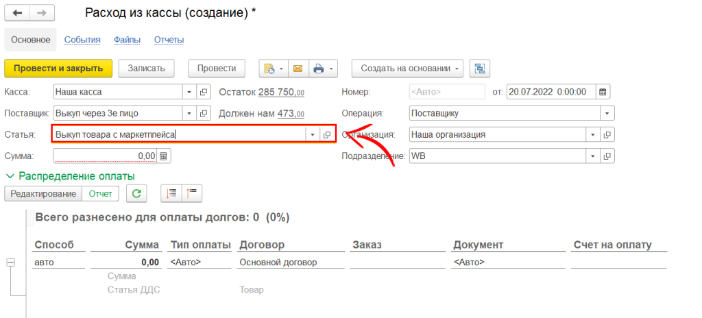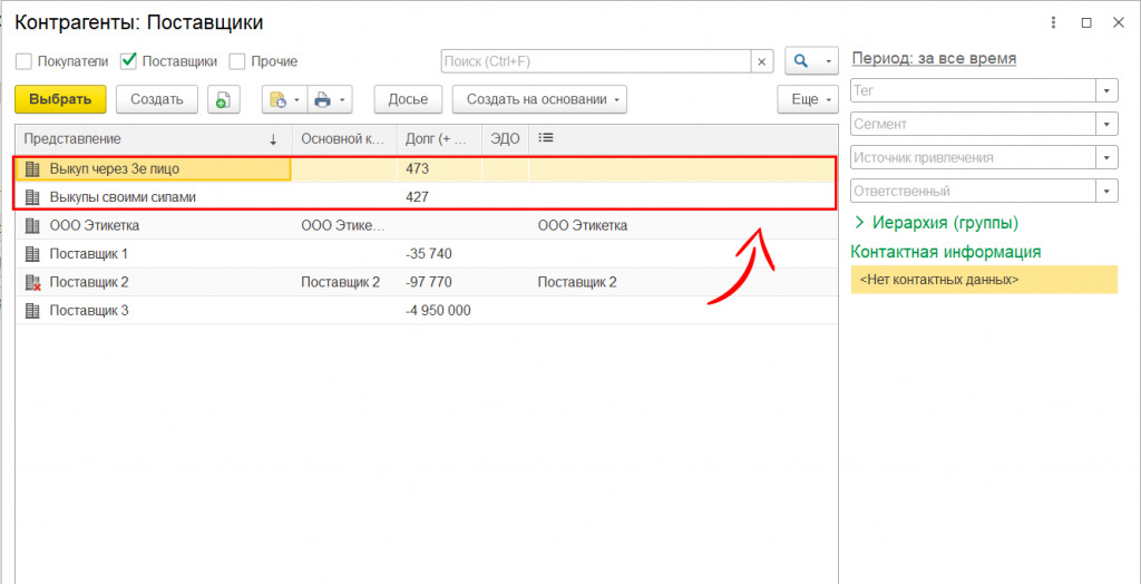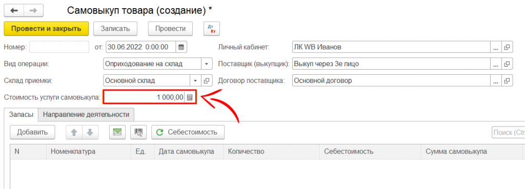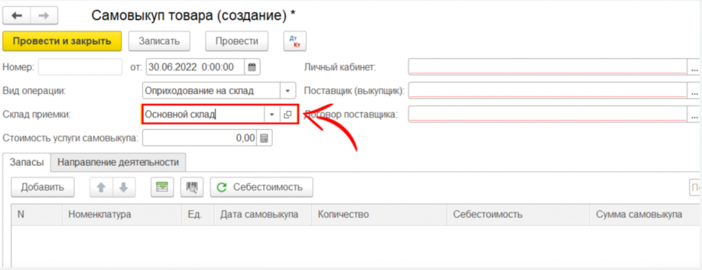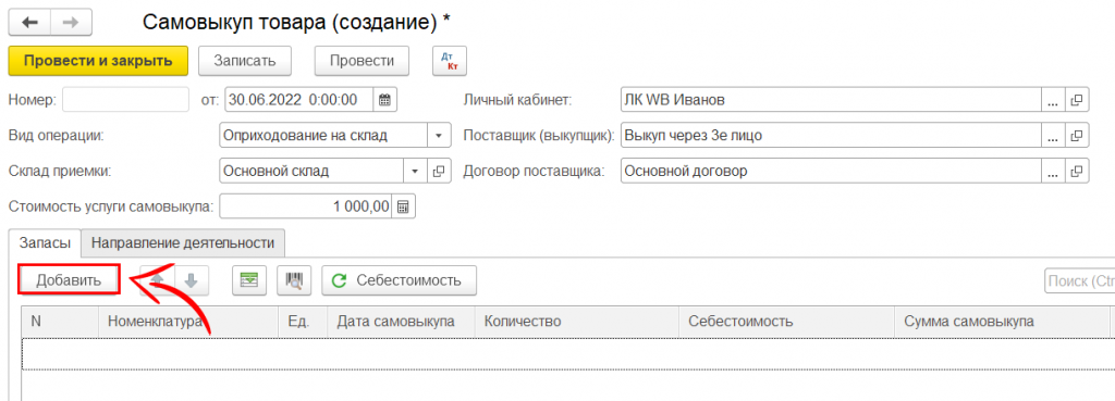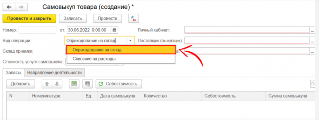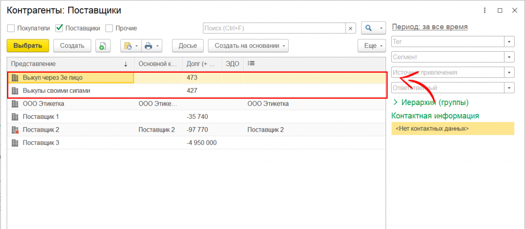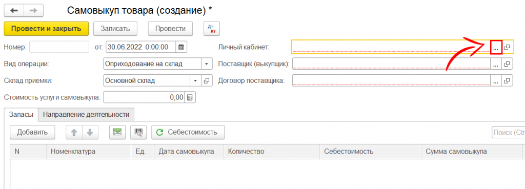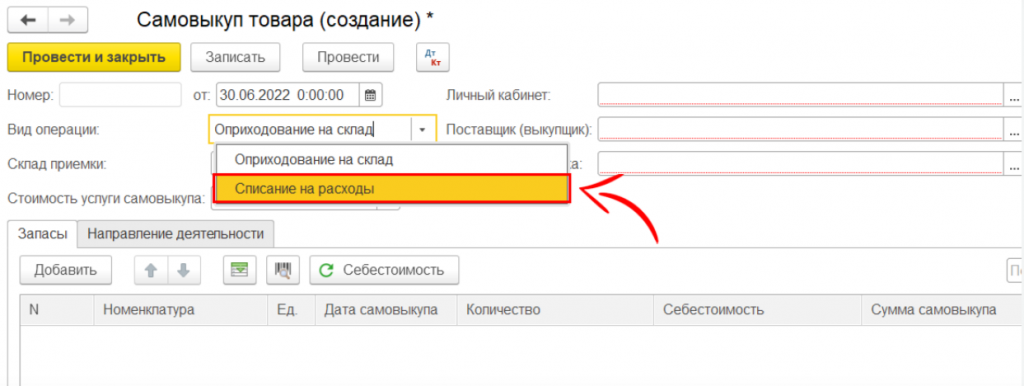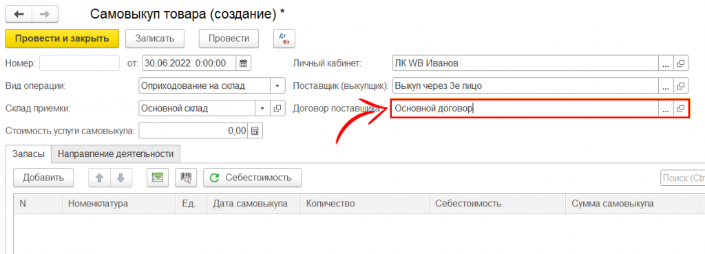 Указываем контрагента поставщика, который оказывает нам услуги выкупа, это либо “Выкуп своими силами,” либо “Выкуп через 3е лицо”.