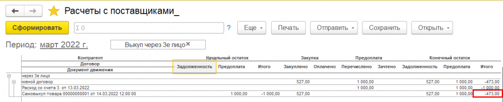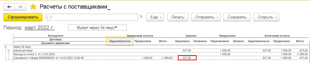 Отчет расчеты с поставщиками, позволяет контролировать задолженность с выкупщиком.