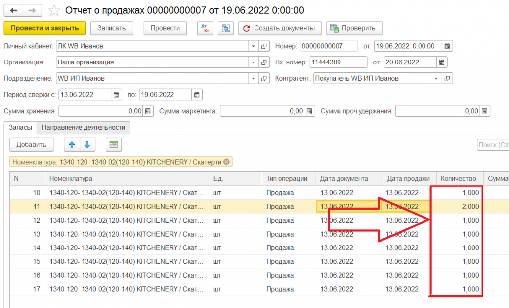 Как видите в данном документе у нас продажи за 19 июня совпадают по количеству, которое подтянулось ранее.