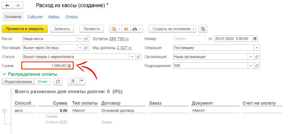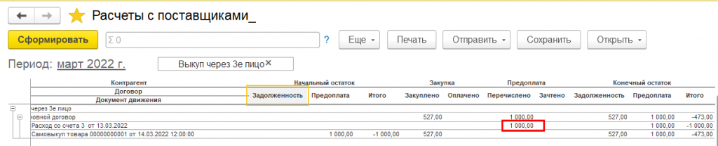 Как мы видим, у нас отражена предоплата выкупщику в сумме 1000 руб.;