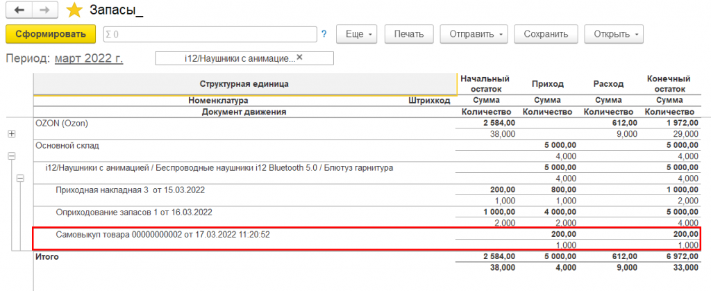 Рассмотрим как выкупы влияют на отчет “Запасы”.